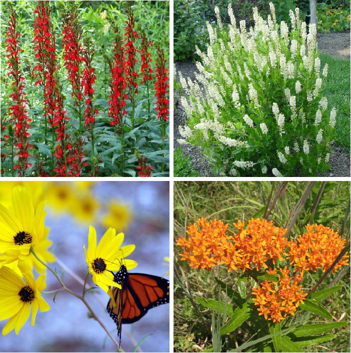 Top Left: Cardinal Flower, Top Right: Sweet Pepperbush, Bottom Left: Swamp Sunflower, Bottom Right: Butterfly Milkweed